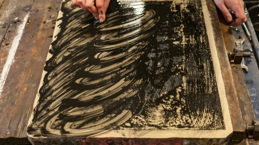 リトグラフの最大の特徴は、水と油の反発作用を利用した化学的な印刷技法にあります。平らな石版や金属板の版面に油性の描画材で絵を描き、特殊な薬品処理を施すことで、インクが付着する部分と付着しない部分を作り出します。版を削る必要がないため、繊細な線や豊かな色彩表現が可能となり、版画の中でも高い再現性を誇ります。